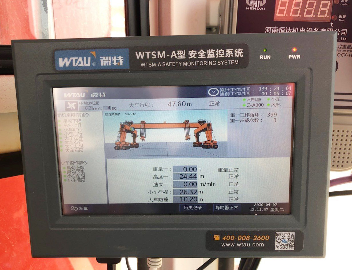 微特為該提梁機配裝的安全監(jiān)控系統(tǒng)對該設備的安全可靠運行起著重要作用。微特研發(fā)的提梁機安全監(jiān)控系統(tǒng)對設備的運行數(shù)據(jù)進行實時監(jiān)控,該儀表可以顯示提梁機的起升高度,起重量,速度,大車行程,小車行程,同軌道防碰撞,風速,工作次數(shù),超載次數(shù)等相關(guān)數(shù)據(jù)實時顯示,并對相關(guān)數(shù)據(jù)進行分析判斷,防止設備向不安全區(qū)域運行。當往不安全區(qū)域運行時,該系統(tǒng)首先會預警,并發(fā)出聲光報警提醒操作人員,并根據(jù)實際情況啟動控制功能,使設備相關(guān)運行機構(gòu)停止運行,以起到保護作用。