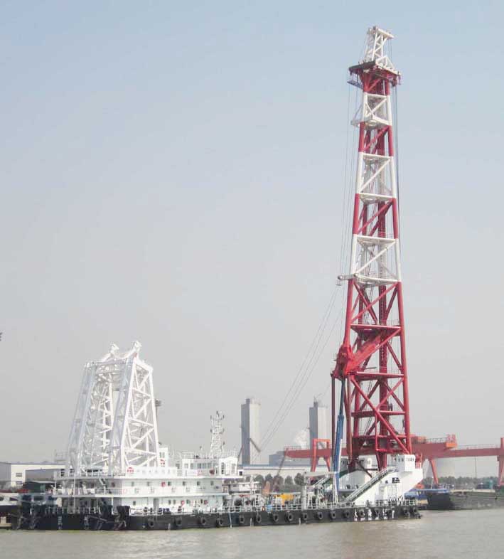 與國(guó)內(nèi)其他打樁船相比,“海威951”打樁船有三大特點(diǎn):一是該船集打樁和吊裝為一體,一次最大抬吊重240噸,還可以做-27°到﹢25°的變幅;二是可插打18.5°的斜樁,其樁基施工的仰俯角度在國(guó)內(nèi)為最大;三是95米高的樁架可進(jìn)行三次變幅折疊,變幅后的樁架距水面高度僅有25.4米,可以抵達(dá)長(zhǎng)江中下游的任何施工地。