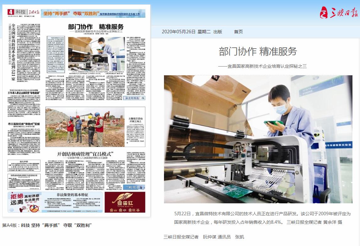 另外,同期第4版科技版刊登微特圖片消息:5月22日,宜昌微特技術(shù)有限公司的技術(shù)人員正在進(jìn)行產(chǎn)品研發(fā)。該公司于2009年被評定為國家高新技術(shù)企業(yè),每年研發(fā)投入占年銷售收入的8.4%。