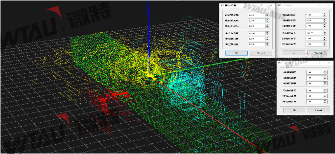 傳感器采用混合固態(tài)多線激光云臺(tái)雷達(dá),通過激光發(fā)射組件快速旋轉(zhuǎn)的同時(shí)發(fā)射高頻率激光束對(duì)外界環(huán)境進(jìn)行持續(xù)性的掃描,獲取點(diǎn)陣列(光)散射到障礙物表面的點(diǎn)云圖案數(shù)據(jù),即障礙物在 360° 區(qū)域環(huán)境中的 3D 信息。在以配置的防碰撞系統(tǒng)軟件運(yùn)用PCL算法庫為基礎(chǔ),獲取到障礙物點(diǎn)云的聚類(即對(duì)物體的三維云識(shí)別)并提取出來,然后計(jì)算障礙物點(diǎn)云到指定平面的最小距離,實(shí)現(xiàn)障礙物最近點(diǎn)的監(jiān)測。